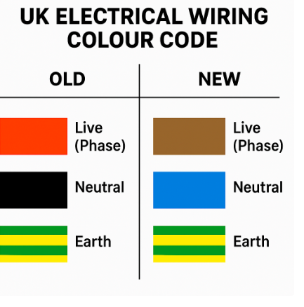 - Old system (pre-2004): Red = Live, Black = Neutral, Green/Yellow = Earth.